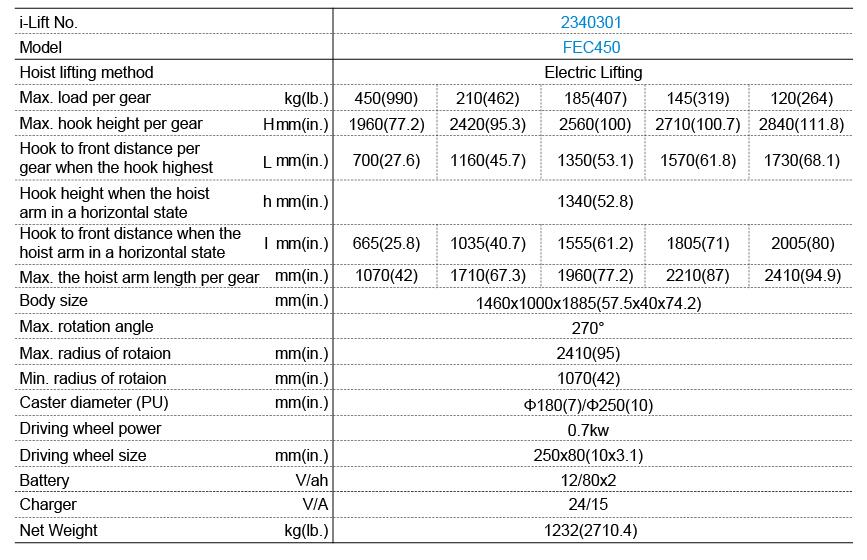 FEC450 is a heavy-duty counterbalanced powered drive workshop crane (built-in ballast weights), with a 270 degree pivoting arm, suitable for lifting loads up to 450kg in line with safety international standards.It equipped with electric winch for lifting and lowering, it is full electric with electric lifting, electric walking and the cantilever extending by electric.In case a fragile loads or awkward placements,lowering speed can be reduced through a knob.