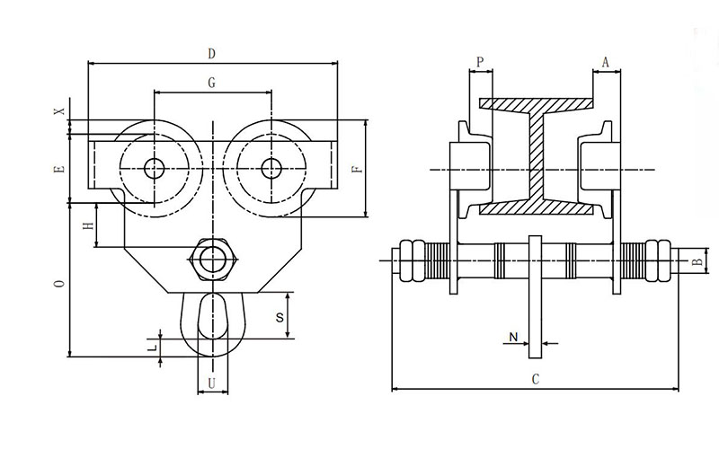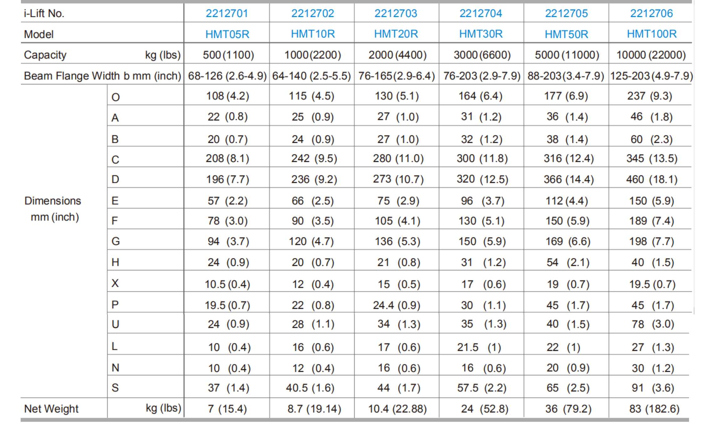 - All models have different capacity with different beam flange width:HMT05R 500kg (1100lbs) with beam flange width: 68-126mm (2.6-4.9in.)