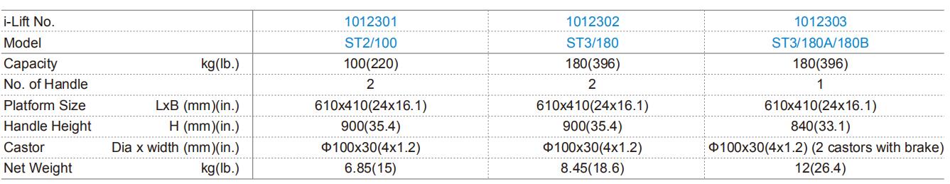 The platform cart has models ST2/100, ST3/180, ST3/180A, ST3/180B.