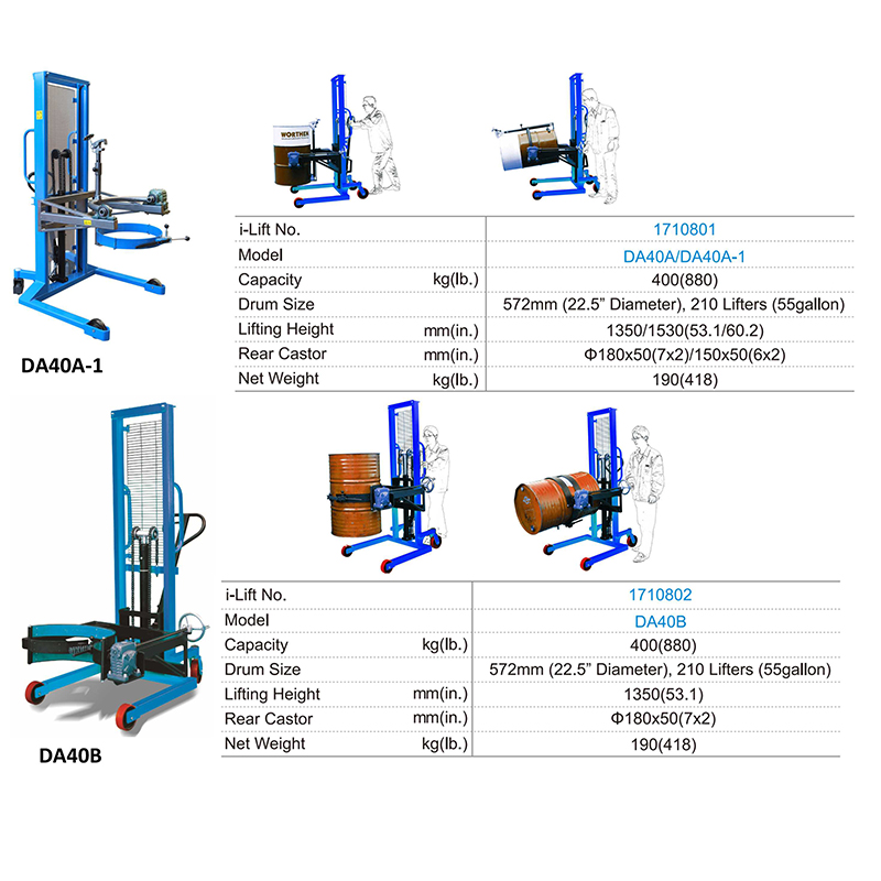 The drum stacker has models DA40A, DA40A-1, DA40B