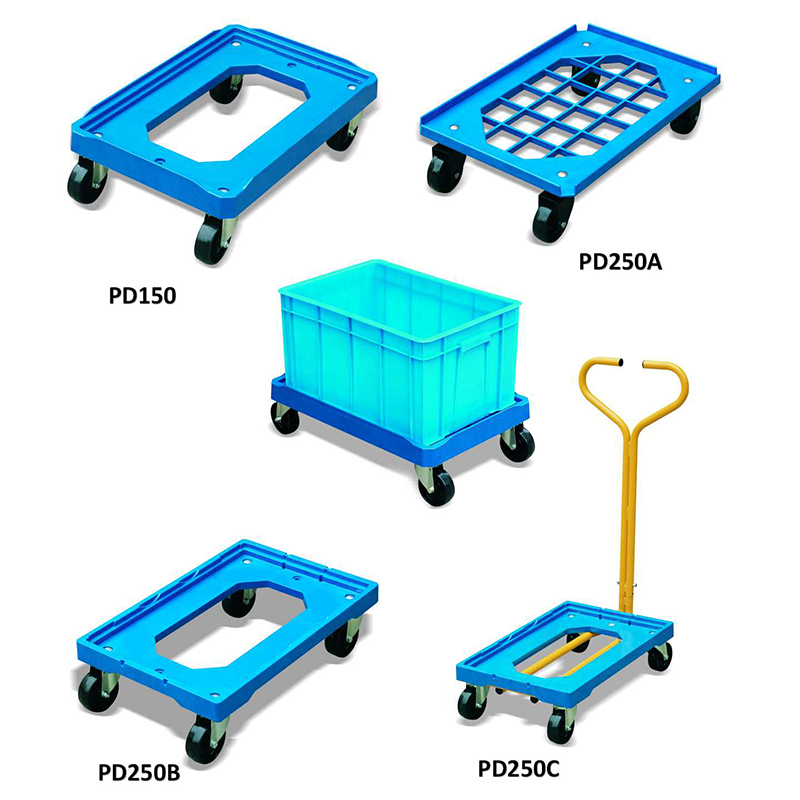 This dolly for plastic dolly is made of plastic. So it is lightweight and easy to move with the four polyolefin swivel casters. Moreover, we have a handle for your option. There is a raised rim around the deck of the plastic dolly to prevent containers or boxes from falling off. The dollies incorporate a carry handle and tow hook for easy carrying and towing with control around any commercial premises. Mounted on 2 fixed and 2 swivel castors (4 swivel castors ) to make mobility hassle-free; an essential addition to any fast-paced work environment. In addition, it has a generous load capacity of 250 kg, and a compact structure, which makes it easily transport and store neatly when not in use.