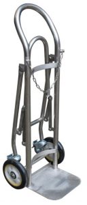 This tilt back hand truck holds one gas cylinder up to 12-inch diameter. This durable cylinder hand cart is designed to roll on two 8" main wheels and has fold-down 3-inch diameter rear casters for safe, convenient transport of medical, industrial and commercial use gases on a 4-wheel base. The cart construction is made with heavy steel with a contoured back cradle and includes a chain to secure the cylinders. Swing-down steel carriages allow use of rear swivel casters for additional safety and control which fold up when not needed.